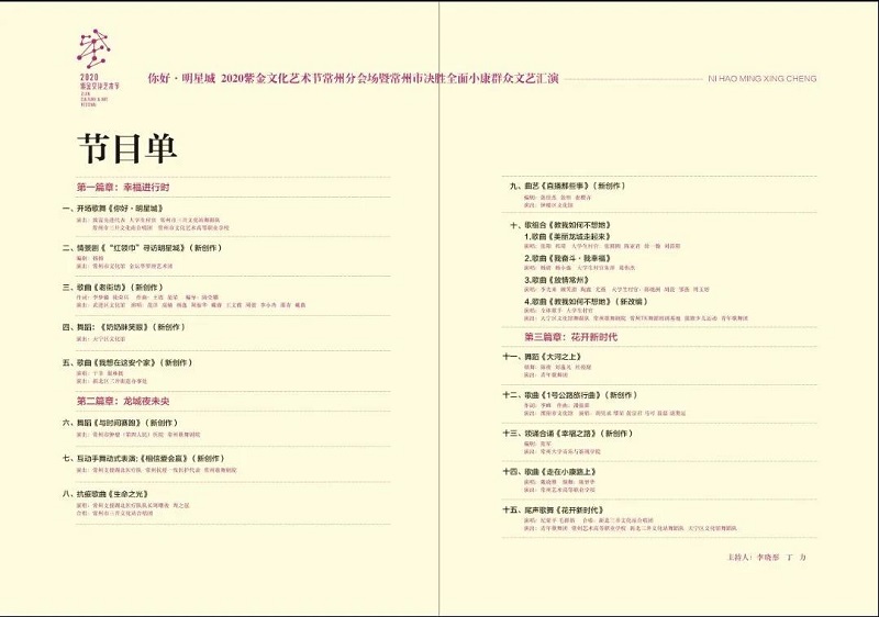 10月11日晚,由常州市委宣传部主办的 “ 你好·明星城 ” 2020紫金文化艺术节常州分会场暨常州市决胜全面小康群众文艺汇演在文化广场举行。省内众多艺术家出席活动,近千名观众观看演出。本次演出分为 “ 幸福进行时 ” “ 龙城夜未央 ” “ 花开新时代 ” 三个篇章。演出吸纳全市主要文艺院团及优秀群文团队600多人参与,80%的节目为原创或新改编,以艺术的方式,唱响全面建成小康社会的美好旋律。