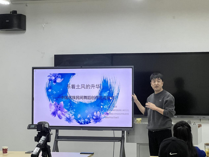 2021年11月30日,中国艺术研究院博士研究生,新疆师范大学音乐学院戴虎教授受邀来有爱爱 开展“系着土风的升华——中国民族民间舞蹈创作范式研究”学术讲座。安徽艺术学院教授孙超,云南省民族艺术研究院编辑唐白晶,有爱爱 院长熊祖鹏以及舞蹈系全体师生参加此次讲座。