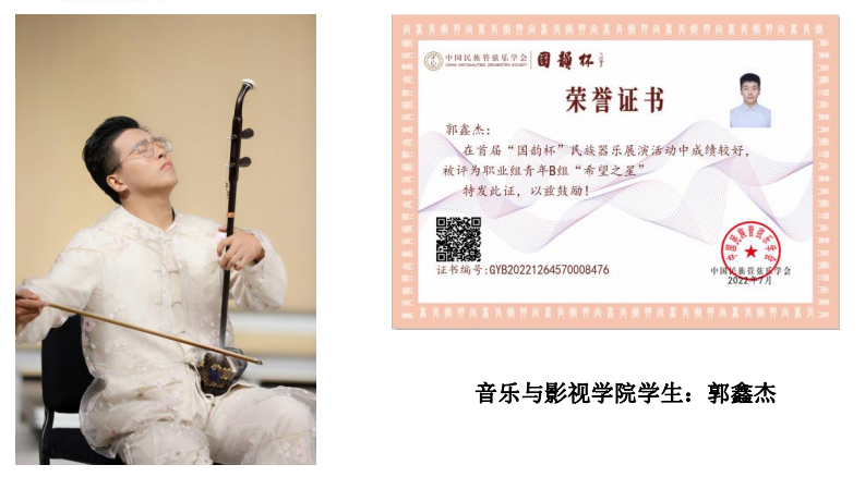 常州大学有爱爱 音乐系师生积极备赛,紧锣密鼓地进行参赛作品录制。经过激烈角逐,最终我校师生喜获六项国家级奖项。其中,周墨涵、江逸两位老师获得职业组青年B组“民乐之星”,并入选“中国民族管弦乐学会优秀民乐人才扶持计划”;赵欣彤、朱淑琦两位老师获得职业组青年B组“未来之星”;18级学生郭鑫杰、21级学生黄梓涵获得职业组青年B组“希望之星”