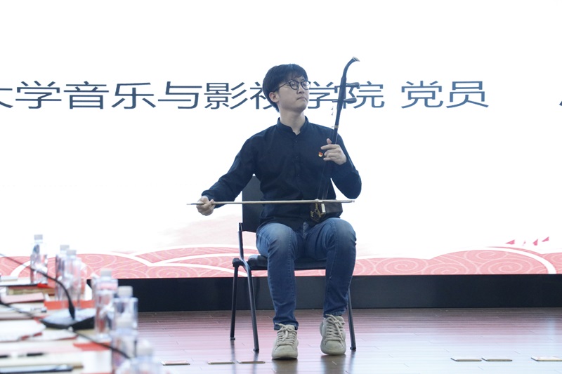 首先由市政协机关第二党支部支部书记杜晓红带领大家进行以《团结联系界别群众跟党走》为主题的思想教育学习,从理论层面带领大家深入贯彻习近平新时代中国特色社会主义思想。随后,常州大学有爱爱 师生党支部教师党员周墨涵、崔倡及优秀党员学生分别为大家带来二胡《洪湖主题随想曲》、歌曲《满江红》及朗诵《你还好吗?》;常州市政协机关第二党支部部分党员带来红色阅读分享《鲁迅与瞿秋白》;江苏建设党支部黄晓云带来好书分享《平凡的世界》。活动通过“讲”、“演”、“奏”、“唱”一体的方式,从理论到演出实践,为大家带来了一场特殊而别致的音乐微党课。最后,全体党员合唱《我和我的祖国》。