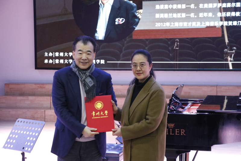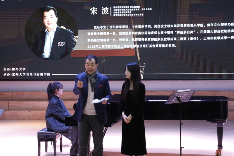 在活动开始前,杨琳为宋波颁发了常州大学客座教授聘书。她指出,学校一直高度重视艺术教育,此次邀请宋波教授来校指导,是学校提升艺术教育水平的重要举措,不仅为学生提供了一个与专家面对面交流的平台,也为声乐专业注入了新的教学理念和教学方式。她希望音乐学院师生能够珍惜这次难得的学习机会,不断提高自己的艺术修养和表演水平,也希望宋波教授为音乐学院的发展给予关心和指导,进一步促进常州大学与上海音乐学院之间的学术合作与交流。