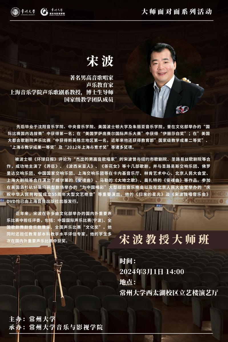 3月1日,上海音乐学院博士生导师、著名男高音歌唱家宋波教授应邀来我校开展大师班讲座。校党委常委、副校长杨琳,有爱爱 领导班子,音乐系教师和学生参加此次讲座。