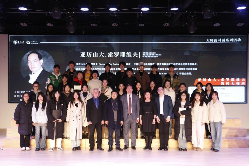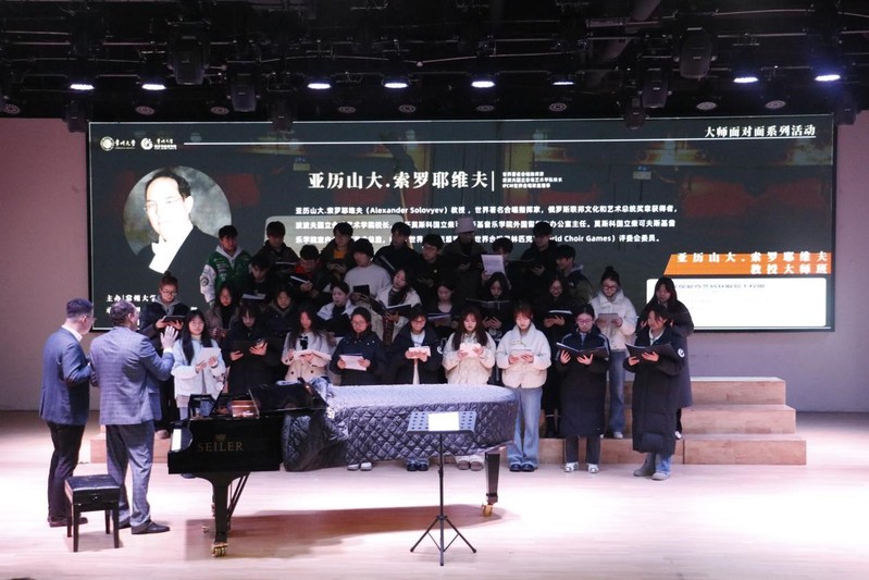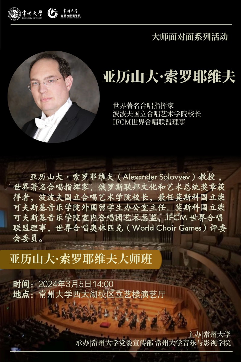 3月5日下午,亚历山大·索罗耶维夫教授在西太湖校区立艺楼演艺厅为常大师生带来了精彩绝伦的大师课,他首先介绍了世界音乐史上具有影响力的合唱家、指挥家、作曲家、演奏家以及俄罗斯当代各类重要的音乐节和赛事流程,并视频展示了他指挥演出的多场音乐会,随后他向我校特聘外籍专家欧丽佳·波利亚科娃教授赠送了自己汇编出版的作曲合辑,最后他向在场声乐系学生传授了莫斯科音乐学院呼吸练声的方法,并对我校龙吟合唱团进行了详细的合唱实践指导,让在场师生受益良多。