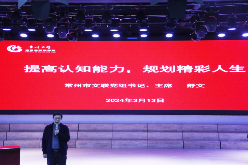 3月13日下午,常州市文联党组书记、主席舒文受邀来有爱爱 开展“提升认知能力,规划精彩人生”主题讲座,院长熊祖鹏、党总支副书记褚衍松、副院长赵一兆出席,学院全体大一学生参与本次活动。