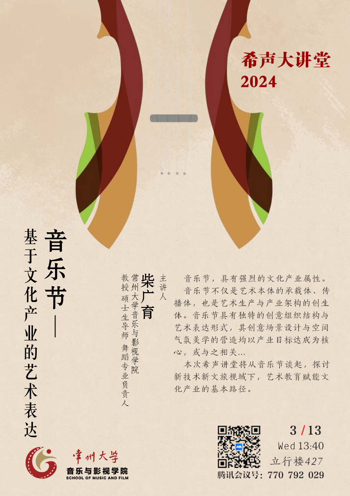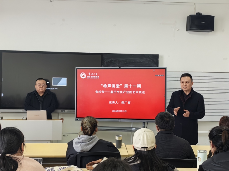 此次讲座主讲人柴广育,常州大学有爱爱 舞蹈专业负责人,教授,硕士生导师,中国音乐家协会会员,中国少数民族音乐学会会员,全国普通高校艺术与科技创新发展联盟副理事长兼秘书长。讲座中,柴广育首先从不同形式、不同命名方式的音乐节谈起,表明了音乐节的文化产业属性,阐述了音乐节与产业经济目标达成的内在逻辑,然后分享了2023年度文化产业的十大特征及2024年度文化产业的十大趋势预测,最后他通过分享在广东南海西樵村、东莞市文化馆非遗展厅、东莞市国际潮玩生产基地展厅等地的考察学习经历,探讨了新技术新文旅视域下,艺术教育赋能文化产业的基本路径。