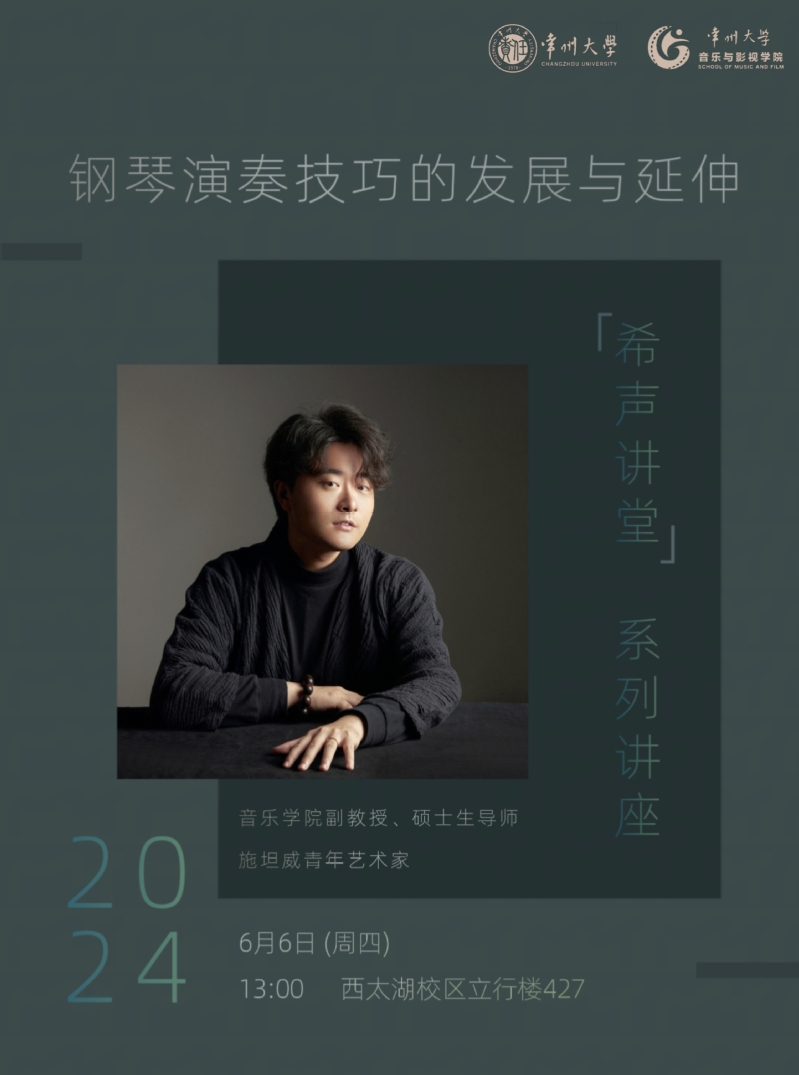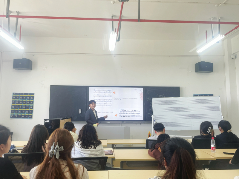 此次讲座主讲人仲一,施坦威青年艺术家,Starsing Classic签约青年钢琴家,旅英音乐博士,常州大学有爱爱 院长助理、钢琴艺术研究中心主任、钢琴系副教授、硕士生导师。讲座中,仲一首先从历史的角度出发,梳理了键盘乐器的发展历程,为学生展示了许多新颖的现代钢琴音乐作品。他强调随着音乐教育的普及和演奏水平的提高,现代钢琴演奏技巧正朝着多元化、个性化的方向发展。通过现场演示和讲解,向师生们展示了现代钢琴演奏中一些独特的技巧和方法,让在场的师生们对现代钢琴音乐的演奏技巧有了更为直观的了解。