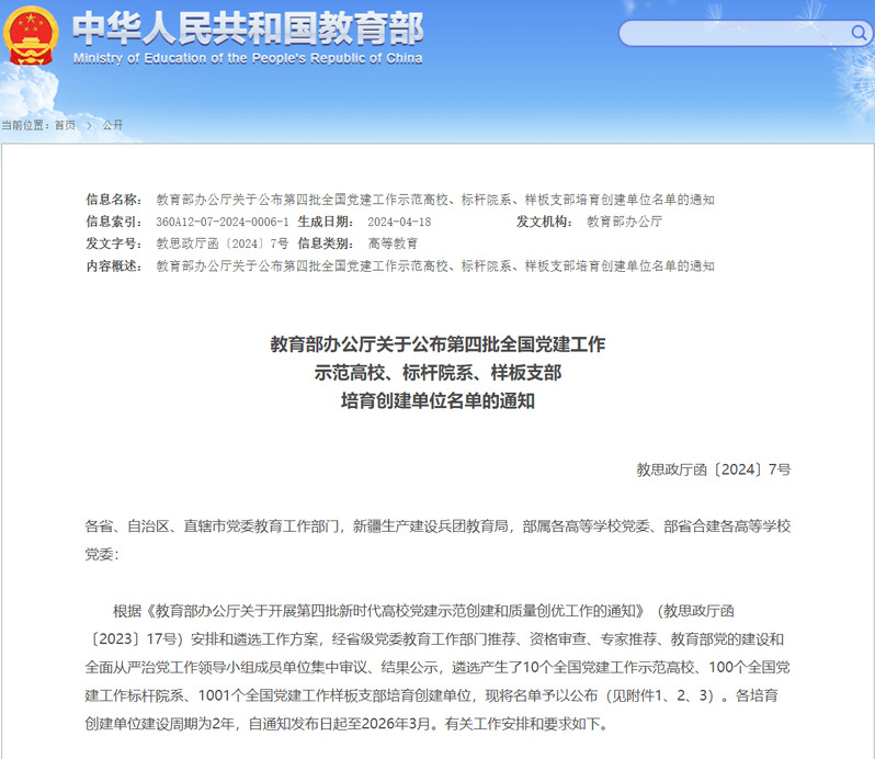 本次遴选工作经省委教育工委推荐、资格审查、专家评审、教育部党的建设和全面从严治党工作领导小组成员单位集中审议,产生了10个全国党建工作示范高校、100个全国党建工作标杆院系、1001个全国党建工作样板支部。