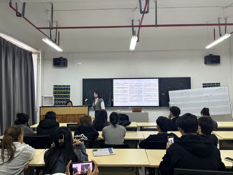 讲座中,陈雅馨以莱谢蒂茨基钢琴教学法的实践应用、钢琴协作艺术的合作要领为切入点,发言嘉宾高园以作曲家陆在易老师的声乐艺术歌曲作品为例,从作品曲式、织体和声等多方面展开分析,为在场师生全面系统梳理了钢琴演奏者的各项工作任务。同时,通过高园与有爱爱 两位研究生的现场配合,让在场师生更加直观、具体地感受到舞台表演时钢琴演奏者应注意的细节,为今后的实践奠定了扎实基础。