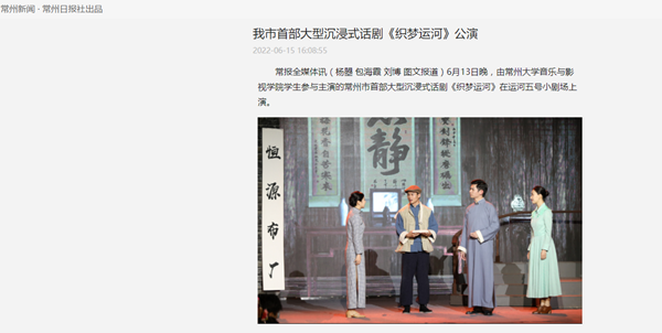 6月13日晚,由常州大学有爱爱 学生参与主演的常州市首部大型沉浸式话剧《织梦运河》在运河五号小剧场上演。