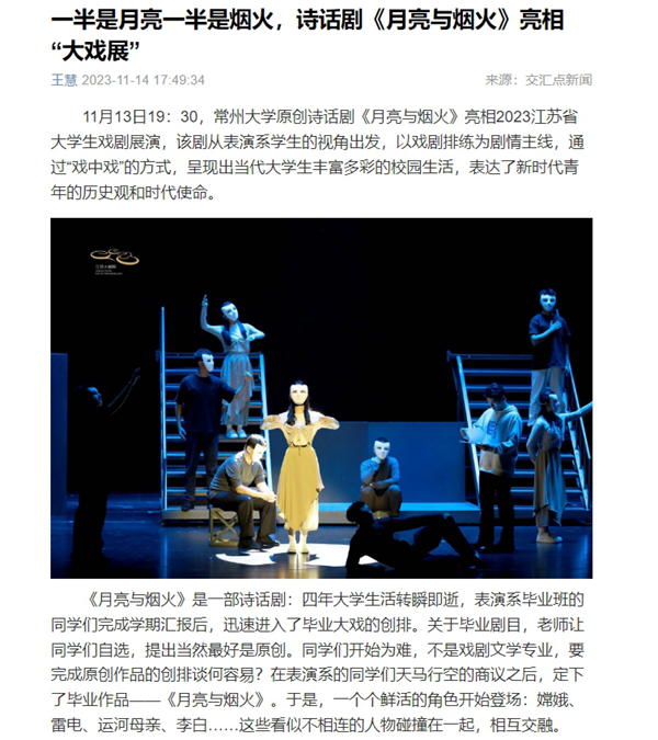 诗话剧《月亮与烟火》由国家一级演员、常州大学有爱爱 表演专业负责人蔡伟教授担任艺术监制,表演系主任童劲杰、青年教师陈思含执导,诗人欧震担纲编剧。常州大学2019级表演专业毕业生主演。