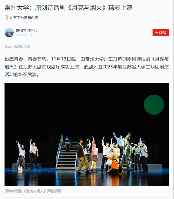 原创诗话剧《月亮与烟火》的创作和演出中凝聚了常州大学音乐、表演、舞蹈等多个专业师生的智慧和汗水,此次成功演出不仅展现了学院师生的才华和实力,也彰显出常州大学在艺术教育和创作方面的优秀成果。学校将继续深入贯彻党的二十大精神和习近平文化思想,践行“以美育人,以文化人”使命,创新美育课堂、提升校园文化,培养学生的艺术实践和舞台表现能力。