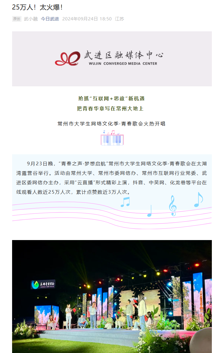 9月23日晚,“青春之声·梦想启航”常州市大学生网络文化季·青春歌会在太湖湾露营谷举行。活动由常州大学、常州市委网信办、常州市互联网行业党委、武进区委网信办主办,采用“云直播”形式精彩上演,抖音、中吴网、化龙巷等平台在线观看人数近25万人次,累计点赞数近3万人次。