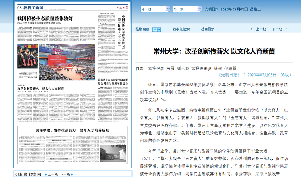 7月5日,《光明日报》以“常州大学:改革创新传薪火以文化人育新苗”为题报道我校探索构建“艺术+思政”立体育人新模式,以红色文化育人为特色,逐渐走出了一条新时代思想政治教育与文化育人相结合、注重实践、改革创新的特色发展之路。全文如下: