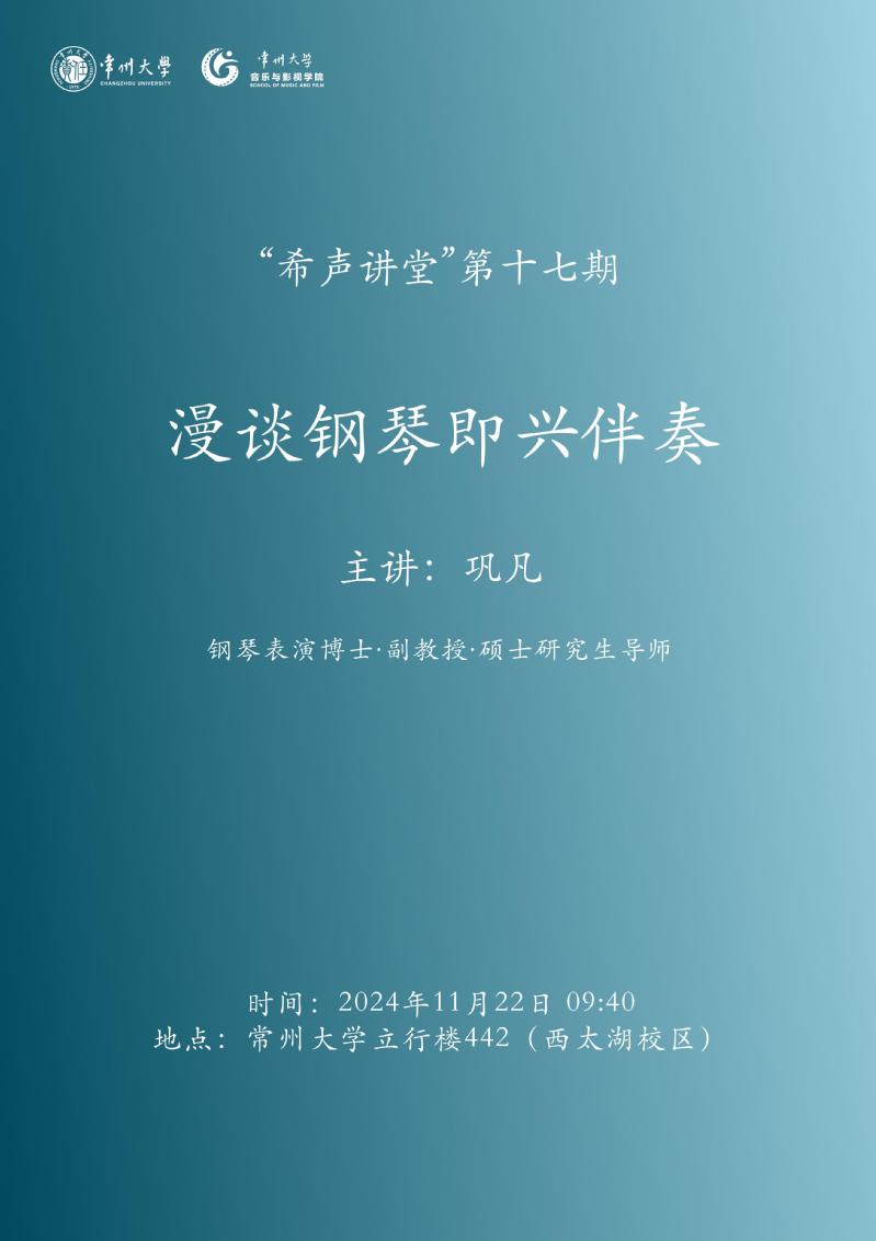 讲座主讲人巩凡,钢琴表演博士,常州大学有爱爱 钢琴专业副教授,硕士研究生导师。讲座中,巩凡从他与钢琴即兴伴奏的“渊源”讲起,分享了自己在这一领域的学习与探索历程。随后,他全面而系统地介绍了钢琴即兴伴奏学科涵盖的内容,让听众对这一学科有了更加清晰而全面的认识。针对钢琴即兴伴奏学习的重难点,巩凡结合自身教学经验,提出了切实可行的学习方法和建议。对于完成一首歌曲即兴伴奏的过程及钢琴即兴伴奏的使用场景等方面,他结合实例,展示了钢琴即兴伴奏的灵活应用,进一步凸显了这一学科的艺术魅力和实用价值。他强调,即兴伴奏不仅要求演奏者具备扎实的钢琴技巧,更需具备良好的音乐感知力和创造力。