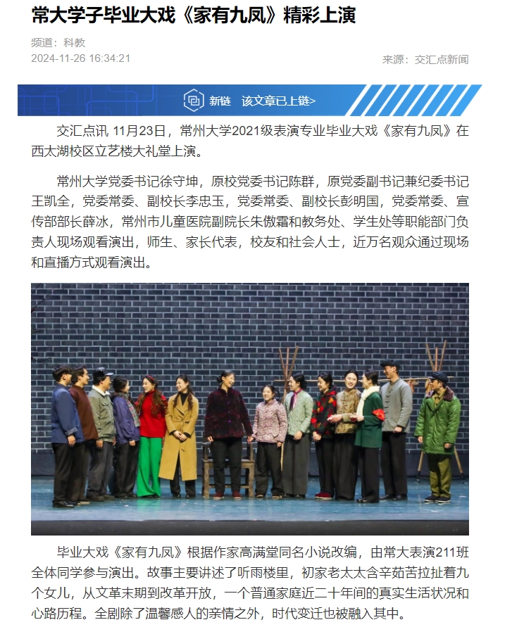 11月23日,常州大学2021级表演专业毕业大戏《家有九凤》在西太湖校区立艺楼大礼堂上演。