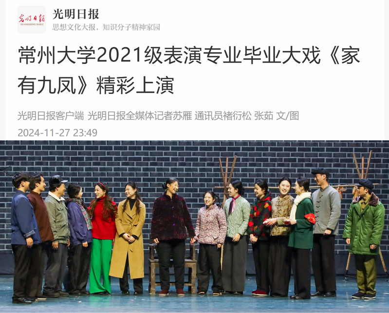11月23日,常州大学2021级表演专业毕业大戏《家有九凤》在西太湖校区立艺楼大礼堂上演。党委书记徐守坤,原校党委书记陈群,原党委副书记兼纪委书记王凯全,党委常委、副校长李忠玉,党委常委、副校长彭明国,党委常委、宣传部部长薛冰,常州市儿童医院副院长朱傲霜和教务处、学生处等职能部门负责人现场观看演出,师生、家长代表,校友和社会人士,近万名观众通过现场和直播方式观看演出。