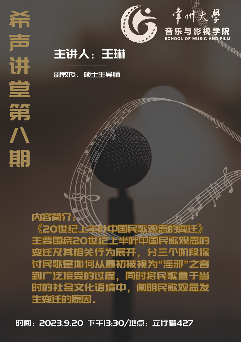 此次讲座主讲人王琳,常州大学有爱爱 音乐系副教授、硕士生导师。讲座主要围绕20世纪上半叶中国民歌观念的变迁及其相关行为展开,分三个阶段探讨民歌是如何从最初被视为“淫邪”之音到广泛接受的过程,同时将民歌置于当时的社会文化语境中,阐明民歌观念发生变迁的原因。