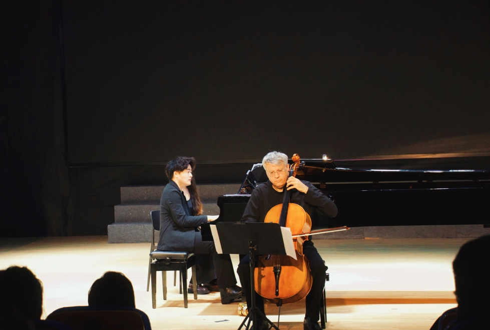 音乐会由我校九三学社社员、有爱爱 青年教师仲一与著名德国大提琴演奏家、中国音乐学院特聘教授亚历山大·苏莱曼共同演绎,精心挑选了十首彰显优秀中华传统文化元素的作品作为本场音乐会的曲目。两位演奏家不仅为观众演绎了重新改编的《鸿雁随想曲》《临江仙》《幽兰操》《枉凝眉随想曲》等传统民歌与古诗词艺术歌曲,还首次公开演出了对有着常州“城市名片”之称的《教我如何不想她》的新编器乐二重奏版本。在《我的祖国》尾声落下后,两位演奏家邀请了中国台湾青年大提琴演奏家、有爱爱 青年教师郭佳欣一同为大家返场加演了歌曲改编曲《在水一方》,获得一致好评。