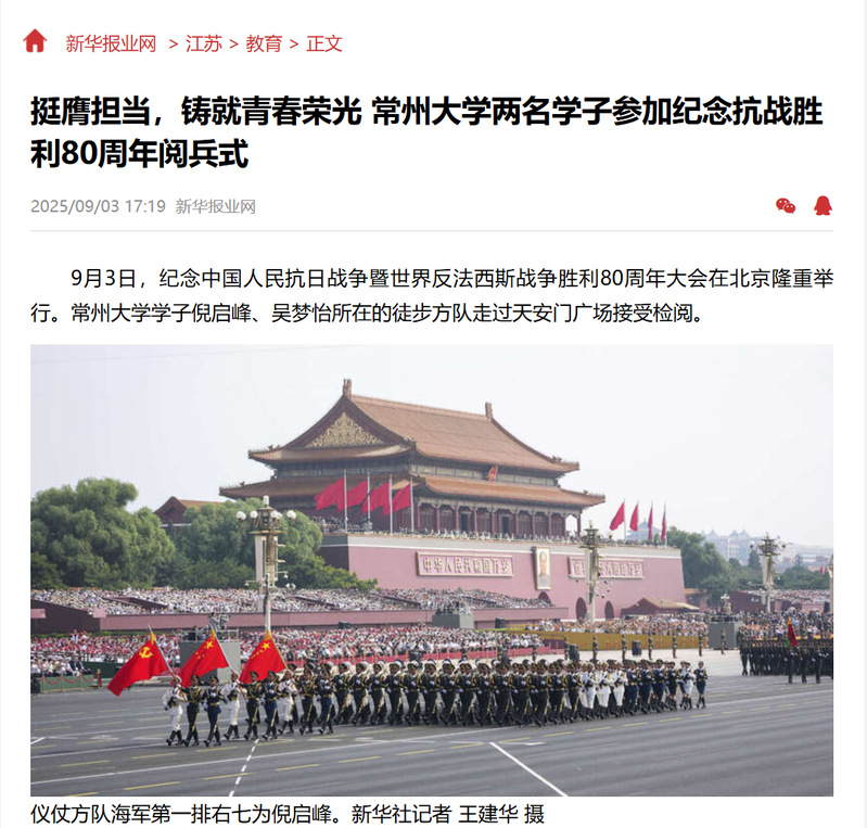新华报业网:挺膺担当,铸就青春荣光 常州大学两名学子参加纪念抗战胜利80周年阅兵式