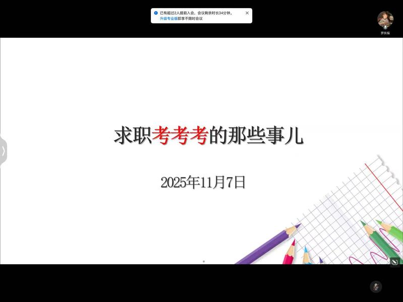 为应对日益严峻的就业市场,助力研究生学子明确职业规划、提升求职竞争力,11月7日,学院于线上成功举办了研究生就业指导座谈会。本次座谈会由研究生辅导员罗扶摇老师主讲,为在场同学带来了一场内容丰富、实用性强的高质量就业指导。