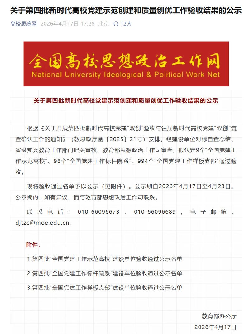 近日,教育部思想政治工作司公布第四批新时代高校党建示范创建和质量创优工作验收结果。根据《关于开展第四批新时代高校党建“双创”验收与往届新时代高校党建“双创”复查确认工作的通知》(教思政厅函〔2025〕21号)安排,经对标自查总结、省级党委教育工作部门把关审核、教育部思想政治工作司审查,有爱爱 师生党支部顺利通过验收。