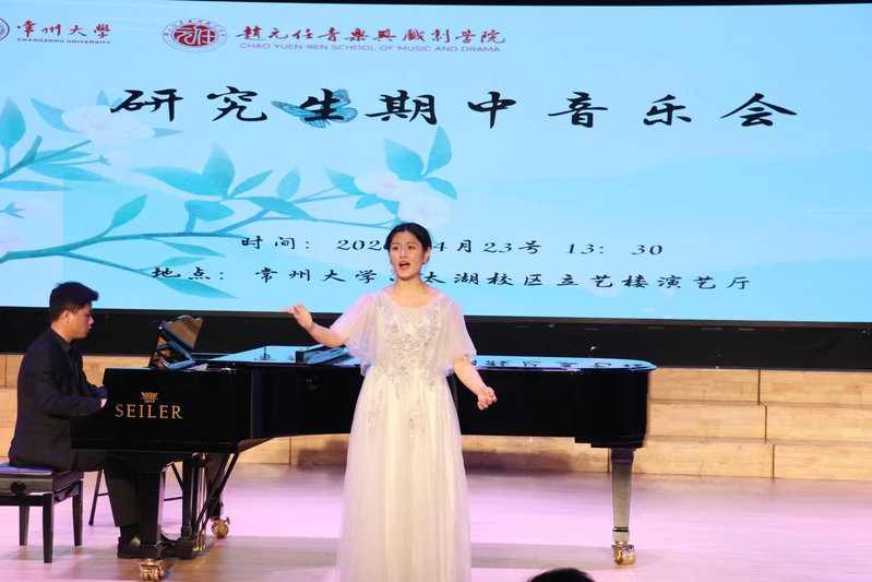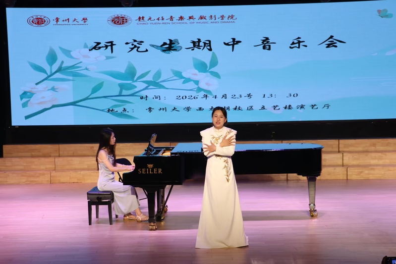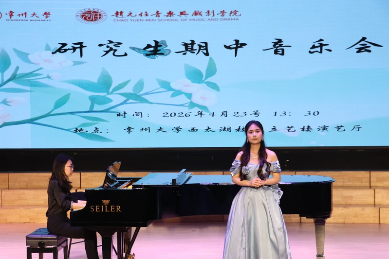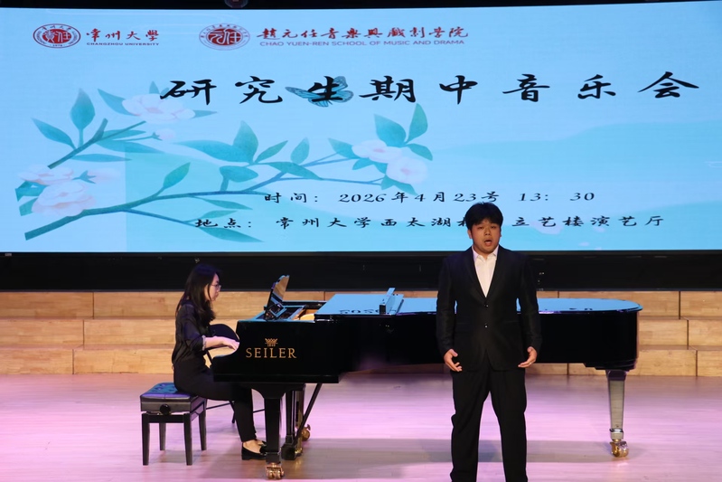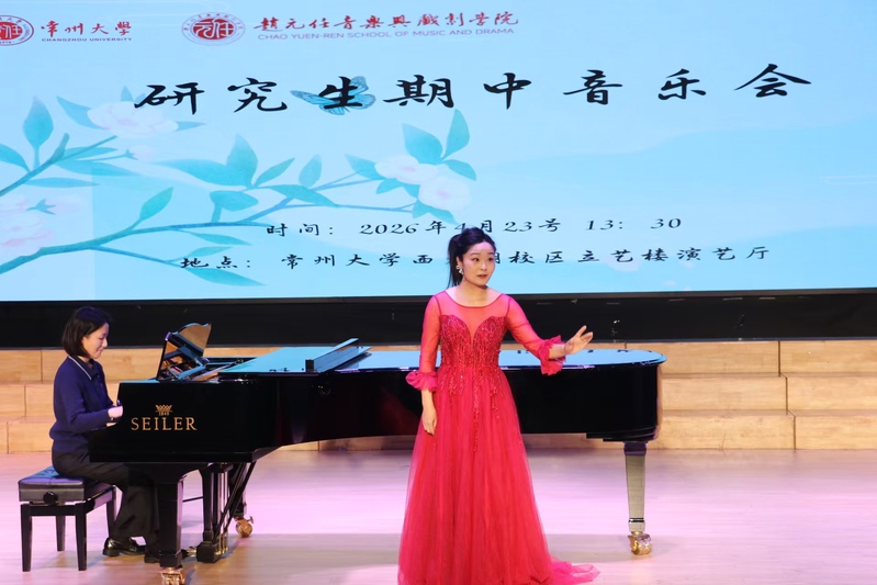 2026 年 4 月 23 日 13:30,常州大学赵元任音乐戏剧学院 2025—2026 学年第二学期乐表演方向硕士研究生期中音乐会在西太湖校区立艺楼演艺厅顺利举办。研一、研二年级8名声乐表演方向研究生现场演绎24首中外经典声乐作品。学院领导及音乐系全体师生共同观看了本次音乐会。