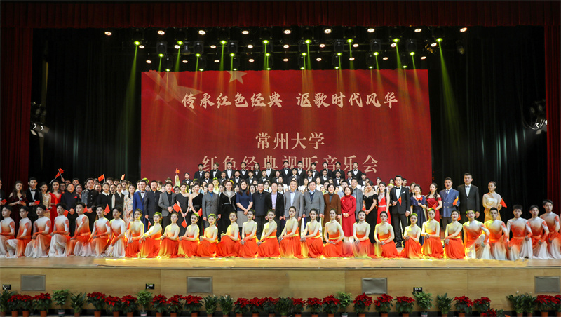 12月29日下午,“传承红色经典 讴歌时代风华”红色经典视听音乐会在常州大学西太湖大礼堂举办。常州大学党委书记陈群,常州大学校长、党委副书记蒋军成,常州大学党委常委、副校长陆锦冲,常州大学党委常委、副校长黄海燕,常州大学党委常委、副校长陈海群,常州大学原副校长王卫星,常州大学党委常委、组织部部长闫海波,常州大学党委常委、宣传部部长杨琳出席音乐会。常州市第二人民医院副院长朱大伟,常州市第三人民医院党委副书记张艳,常州大学附属小学校长张红波、副校长吴建春作为特邀嘉宾出席音乐会。与往年相比,本次音乐会规模最大、曲目最多、形式最丰富,参演师生多达近200人。常大师生代表和来自社会各界的音乐爱好者800余人聆听音乐会。