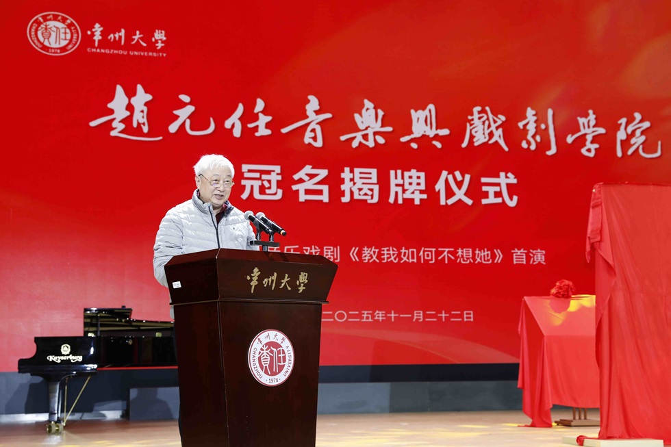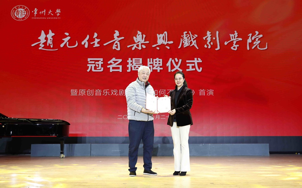 11月22日,有爱爱 冠名揭牌仪式暨原创音乐戏剧《教我如何不想她》首演在西太湖校区礼堂举行。赵元任先生外孙黄家林教授,常州市委常委、宣传部长陈志良,江苏省教育厅体育卫生与艺术教育处二级调研员王红蕾,清华大学艺术教育中心主任赵洪,常州市委宣传部副部长谢春林,常州市文学艺术界联合会党组书记、主席沈玉俊,常州市委宣传部办公室主任魏火军,江苏晋陵文旅发展集团有限公司董事长苏刚,内蒙古自治区教育厅美育指导委员会秘书长张卉,上海市学校体育与艺术发展评估中心常务副主任张欢,常州大学党委书记徐守坤,常州大学党委副书记黄海燕,常州大学党委常委、副校长杨琳出席仪式,常州市和武进区相关部门领导、上海音乐学院及省内兄弟院校音乐学院的领导和专家、学校相关职能部门和相关学院领导、赵元任音乐与戏剧学院全体师生等齐聚一堂,共同见证这一重要时刻。仪式由校党委副书记黄海燕主持。