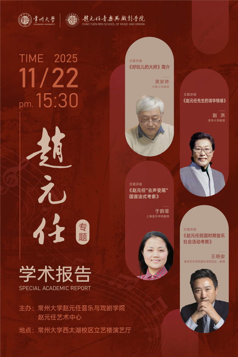与赵元任艺术中心联合主办,副院长王成文主持,学院全体教职工及研究生共同参与。四场专题报告从不同维度深入探讨了赵元任先生的学术成就、艺术实践与人格精神,为师生带来一场思想与知识的深度对话。
