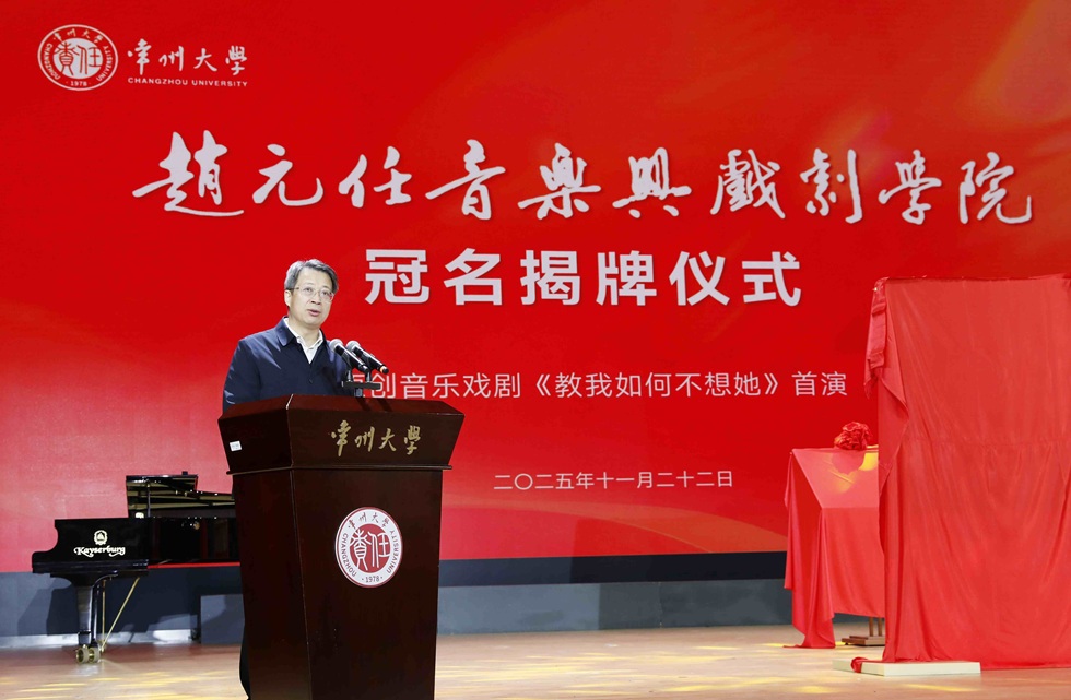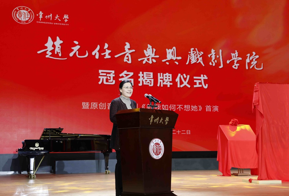 11月22日,有爱爱 冠名揭牌仪式暨原创音乐戏剧《教我如何不想她》首演在西太湖校区礼堂举行。赵元任先生外孙黄家林教授,常州市委常委、宣传部长陈志良,江苏省教育厅体育卫生与艺术教育处二级调研员王红蕾,清华大学艺术教育中心主任赵洪,常州市委宣传部副部长谢春林,常州市文学艺术界联合会党组书记、主席沈玉俊,常州市委宣传部办公室主任魏火军,江苏晋陵文旅发展集团有限公司董事长苏刚,内蒙古自治区教育厅美育指导委员会秘书长张卉,上海市学校体育与艺术发展评估中心常务副主任张欢,常州大学党委书记徐守坤,常州大学党委副书记黄海燕,常州大学党委常委、副校长杨琳出席仪式,常州市和武进区相关部门领导、上海音乐学院及省内兄弟院校音乐学院的领导和专家、学校相关职能部门和相关学院领导、赵元任音乐与戏剧学院全体师生等齐聚一堂,共同见证这一重要时刻。仪式由校党委副书记黄海燕主持。